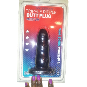 Satisfy your desire for anal adventures with the 5inch Medium Triple Ripple butt plug. This thick plug has a unique shape that starts off petite at the head then gradually widens and tapers into 3 big bumps for tons of sensation during insertion and removal. The wide base makes it safe, and compatible with an O-ring type harness. As with any anal toy, you'll want to use lots of lube. Water-based formulas works best with our rubber material. Available in color Black.